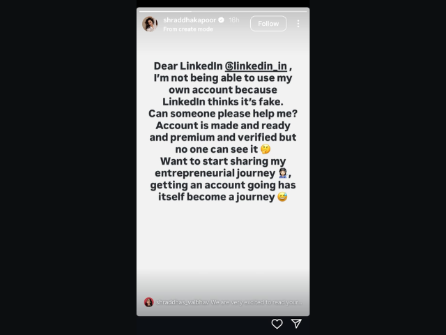 In her Instagram Story, Shraddha Kapoor directly appealed to LinkedIn, writing, “Dear LinkedIn, I’m not being able to use my own account because LinkedIn thinks it’s fake. Can someone please help me? Account is made and ready and premium and verified but no one can see it." While narrating the inconvenience, the actress injected humor into the situation by remarking that “getting an account going has itself become a journey." Kapoor has previously expressed interest in sharing her entrepreneurial experiences, making the setback even more ironic for her fans who expected to follow her professional journey on the platform.