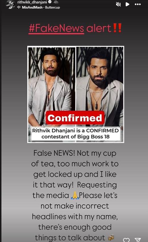 Ever since the promo was released, Bigg Boss 18 has created a buzz and several names have surfaced as potential contestants for the upcoming season, which is being hosted by none other than Salman Khan. Among them was actor Rithvik Dhanjani. Amid speculations that Rithvikk has been approached for show, the actor on Tuesday took to his Instagram story to refute the claims.