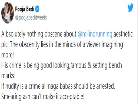 Actress and columnist Pooja Bedi is who is best remembered for her role in Jo Jeeta Wohi Sikandar has backed the controversial picture of model-actor Milind Soman running nude in Goa beach. She said that there is ‘absolutely nothing obscene’ about the photo and called it ‘aesthetic’. Taking to her Twitter handle, Pooja Bedi compared the image of Milind with those of bare Naga sadhus and tweeted, “Absolutely nothing obscene about @milindrunning aesthetic pic. The obscenity lies in the minds of a viewer imagining more! His crime is being good looking, famous & setting bench marks! If nudity is a crime all naga babas should be arrested. Smearing ash can’t make it acceptable!”