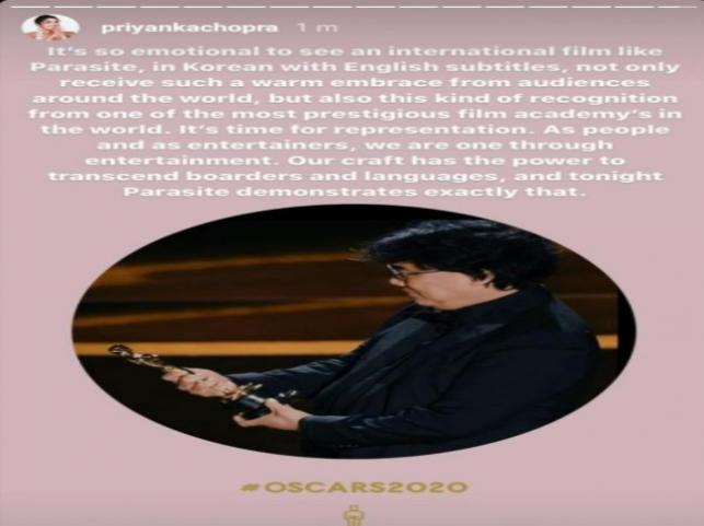 South Korean Parasite was the big winner at the 92nd Academy Awards as the film ended up winning four awards at the most prestigious Hollywood award show. Congratulating the team, Priyanka Chopra penned a beautiful message for the 'Parasite' team. The actress also took the opportunity to make a call for representation in the entertainment industry. Applauding the team, PeeCee wrote, “It is so emotional to see an international film like parasite, in Korean with English subtitles, not only receive such a warm embrace from audiences around the world but also this kind of recognition from one of the most prestigious film academy’s in the world,” Priyanka wrote on her Insta story with a picture of Parasite’s director Bong Joon Ho.