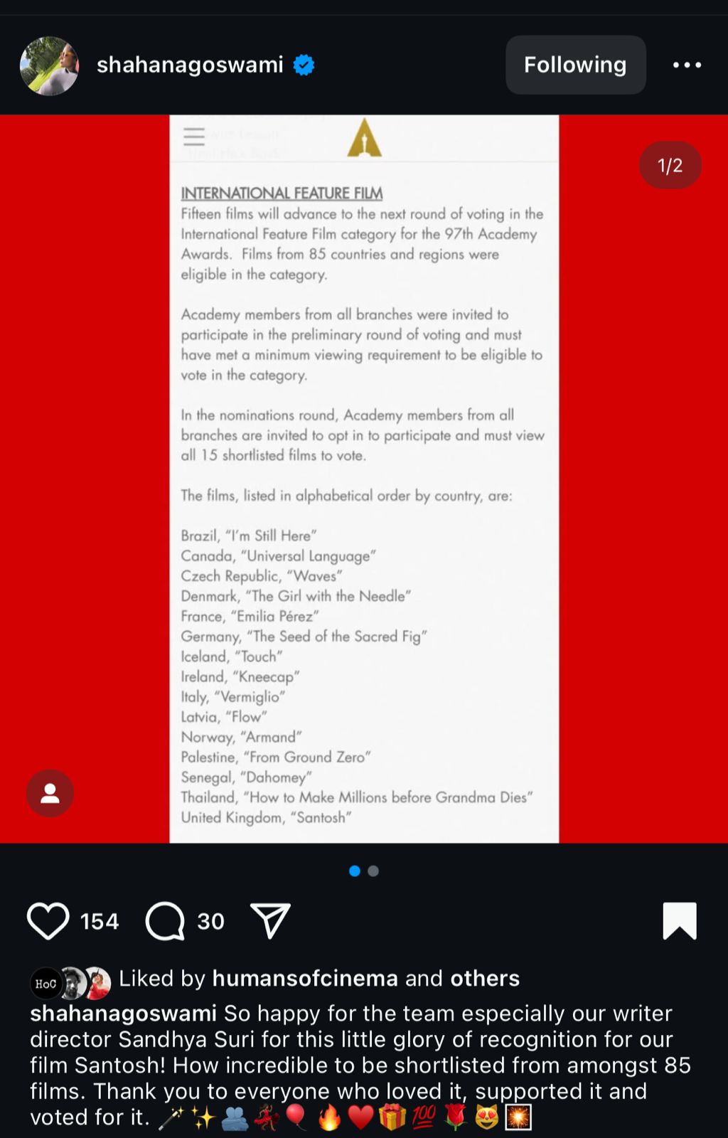 "So happy for the team especially our writer-director Sandhya Suri for this little glory of recognition for our film Santosh! How incredible to be shortlisted from amongst 85 films. Thank you to everyone who loved it, supported it and voted for it," she wrote.