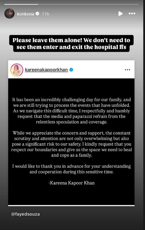 "It has been an incredibly challenging day for our family, and we are still trying to process the events that have unfolded. As we navigate this difficult time, I respectfully and humbly request that the media and paparazzi refrain from the relentless speculation and coverage," Kareena stated.