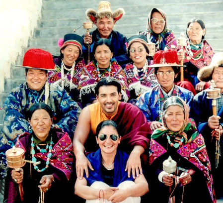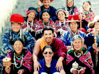 Talking about the picture shared, Pooja Bhatt and John Abraham are seen sitting on stone steps, surrounded by local residents of Kaza in Spiti Valley.