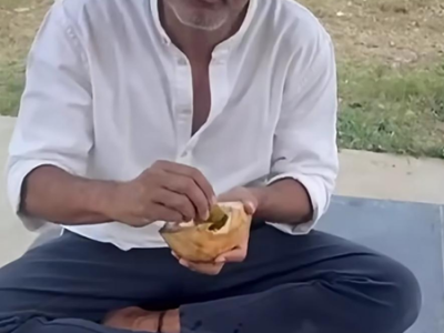 The actor, holding half of the coconut shell in one hand, is seen using a small scrap piece to scoop out the soft malai, devouring it all.