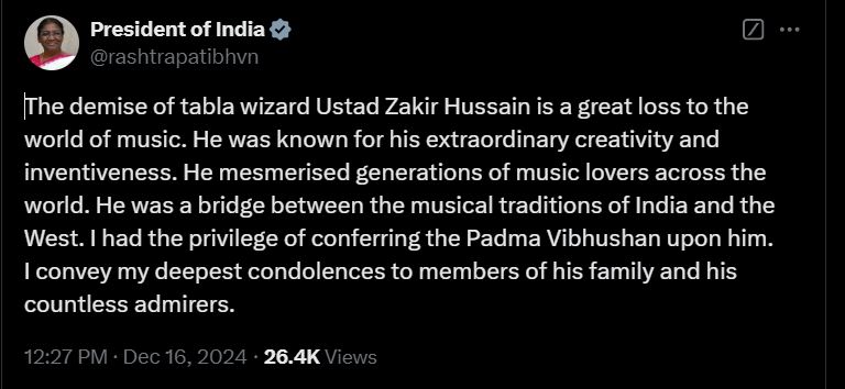 "The demise of tabla wizard Ustad Zakir Hussain is a great loss to the world of music. He was known for his extraordinary creativity and inventiveness. He mesmerised generations of music lovers across the world. He was a bridge between the musical traditions of India and the West. I had the privilege of conferring the Padma Vibhushan upon him. I convey my deepest condolences to members of his family and his countless admirers," she wrote.