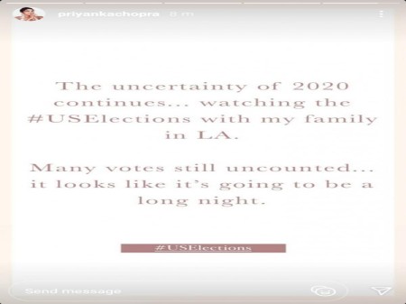 It's election day in the United States and Americans are waiting eagerly for the new President to assume power Whether Donald Trump will serve a second term as president or if Joe Biden will become the 46th president, celebs have been vocal throughout campaign, with many encouraging their fans to vote by mail or head to the polls. While the voting has officially ended and counting has begun, the tough fight between the two candidates has got everyone excited including our desi girl Priyanka Chopra Jonas. The Baywatch actress took to her Instagram Stories to reveal that she is watching the election results with her family in Los Angeles.