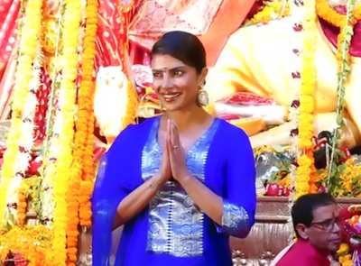 The diva was captured by IANS, offering prayers to Maa Durga wearing a beautiful blue salwar kameez, paired with silver jhumkas, with her hair tied in a low bun. After offering her prayers, PeeCee was seen posing with filmmaker Ayan Mukerji and Tanishaa Mukerji, along with other devotees.
