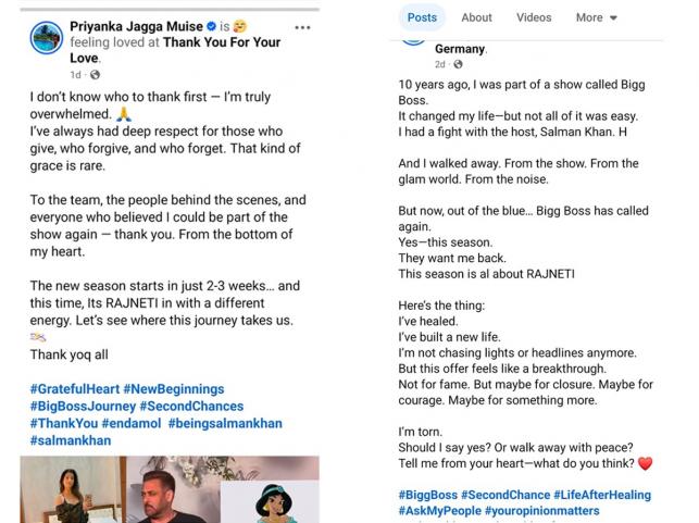 On Tuesday, August 5 Priyanka Jagga posted a long message Priyanka stated, "10 years ago, I was part of a show called Bigg Boss. It changed my life – but not all of it was easy. I had a fight with the host, Salman Khan. And I walked away. From the show. From the glam world. From the noise. But now, out of the blue... Bigg Boss has called again. Yes-this season. They want me back. This season is all about RAJNEETI. Here's the thing: I've healed. I've built a new life. I'm not chasing lights or headlines anymore. But this offer feels like a breakthrough. Not for fame. But maybe for closure. Maybe for courage. Maybe for something more. I'm torn. Should I say yes? Or walk away with peace?"