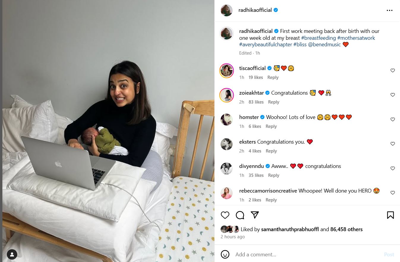 Taking to Instagram, Radhika shared a photograph with the newborn, in which she is seen breastfeeding. The image also highlighted her return to work following her maternity leave.