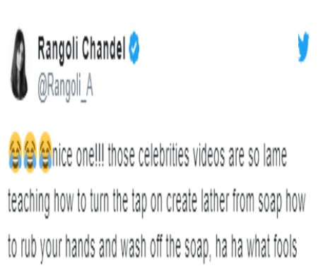 Kangana Ranaut’s sister Rangoli Chandel has once again targetted B-town celebs on social media. This time the outspoken Rngoli slammed all the celebrities taking the #SafeHands Challenge initiated by WHO. Tagging the #SafeHands challenge as lame, Rangoli wrote on Twitter, “nice one!!! those celebrities videos are so lame teaching how to turn the tap on create lather from soap how to rub your hands and wash off the soap, ha ha what fools.”