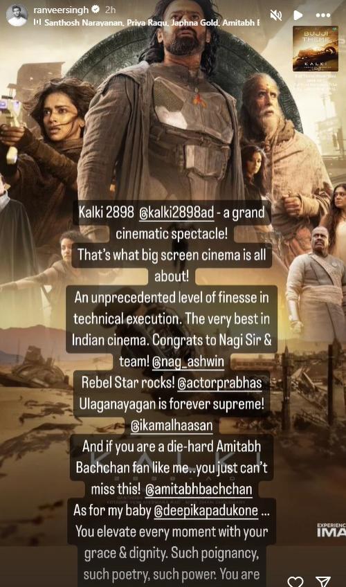 Ranveer began his review by saying, "Kalki 2898 @kalki2898ad - a grand cinematic spectacle! That's what big screen cinema is all about! An unprecedented level of finesse in technical execution. The very best in Indian cinema." Congratulating director, Nag Ashwin, he wrote, "Congrats to Nagi Sir & team! @nag_ashwin," and went on to praise Prabhas as well as Kamal Haasan, mentioning, "Rebel Star rocks! @actorprabhas Ulaganayagan is forever supreme! @ikamalhaasan."