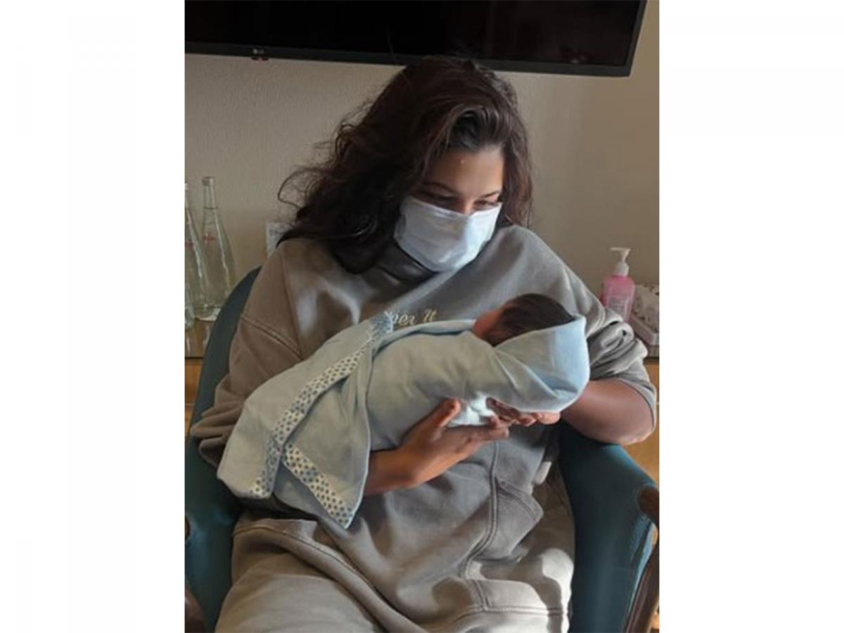 In the image, Rhea is seen dressed in comfortable athleisure and wearing a protective face mask while cradling the newborn.