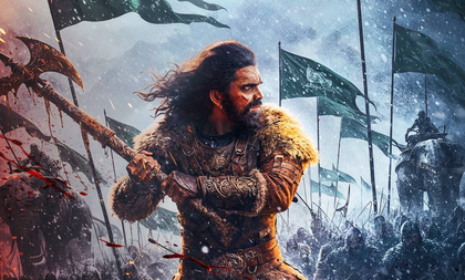 The first-look poster is a striking visual set against a storm-lashed, snow-covered battlefield. Rishabh appears in mid-charge, brandishing a giant, blood-soaked battle axe with fierce resolve.