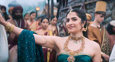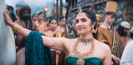The trailer of the film was unveiled on Monday, and features Rukmini Vasanth in the role of Princess Kanakavathi. Clad in a turquoise drape with golden-embellished borders and adorned with ornate jewellery, a statement necklace, stacked bangles, heavy jhumkas, arm cuffs, waist belt, nose pin, and a maang tikka, Rukmini exudes timeless elegance.