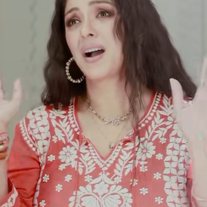 Rupali is wearing an orange coloured chikankari kurta, and her hair is styled in a wavy manner.