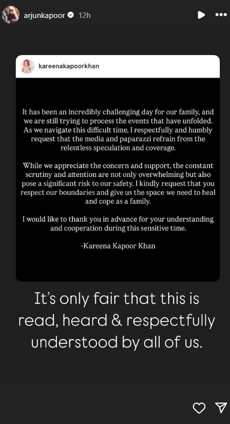 Actor Arjun Kapoor, who shares a close bond with Kareena, reached out to Saif's family during a difficult time. He even urged all to respect their privacy.