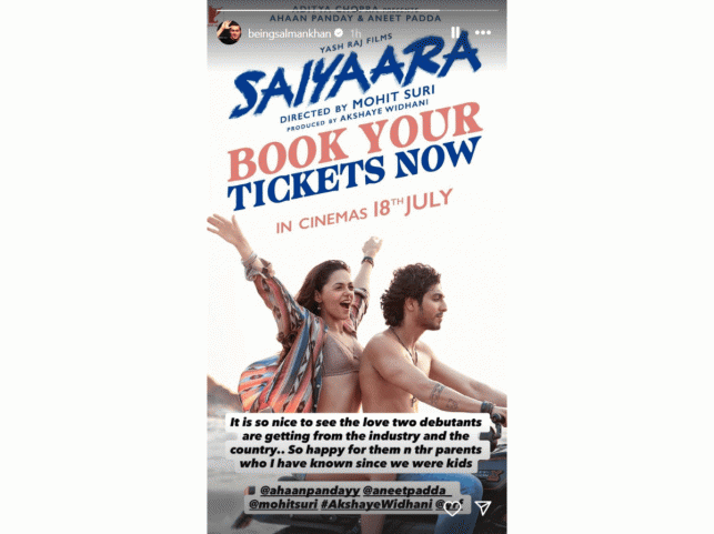 Saiyaara Advance Booking: Bollywood megastar Salman Khan has expressed his happiness over the warm reception debutants Ahaan Panday and Aneet Padda are receiving ahead of the release of their film Saiyaara. The romantic drama directed by Mohit Suri, produced by Yash Raj Films is scheduled to release in theatres this week. On Thursday evening, Salman took to Instagram Stories to share a poster of the film’s advance bookings. Alongside the image featuring Ahaan and Aneet, the actor wrote, “It is so nice to see the love the two debutants are getting from the industry and the country. So happy for them and their parents who I have known since we were kids.”