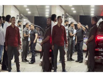 The actor arrived at the private gathering on Monday with tight security around him. The 'Bajrangi Bhaijaan' actor was seen greeting paparazzi outside the venue.