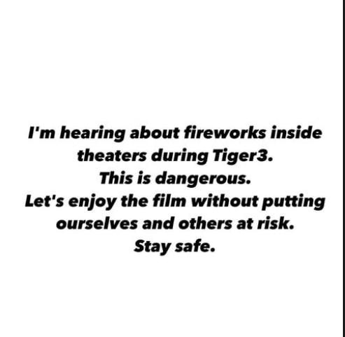 A day after Salman Khan starrer Tiger 3 was released in theatres. A video from Mohan Cinema in Malegaon, in Nashik, Maharashtra has gone viral. The video shows people bursting crackers as Tiger 3 is playing on screen. People can be seen running for safe space after the crackers start to burst. Today, on November 13th, Khan took to his Instagram story to write about this incident. He called it 'dangerous' and urged people to stay safe. He wrote, "I'm hearing about fireworks inside theatres during Tiger 3. This is dangerous. Let's enjoy the film without putting ourselves and others at risk. Stay safe."