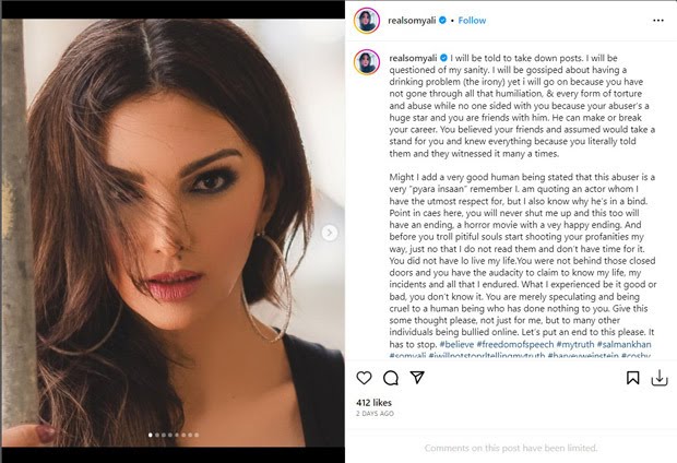 Somy Ali quotes an actor she respects who referred to the abuser as a "pyara insaan." She refuses to be silenced and believes there will be a positive ending to this situation, likening it to a horror movie. Somy Ali disregards profane comments from trolls and asserts that others cannot truly understand her experiences or judge her. She concluded her post by adding, “You are merely speculating and being cruel to a human being who has done nothing to you. Give this some thought please, not just for me, but to many other individuals being bullied online. Let’s put an end to this please. It has to stop.” Somy Ali was a part of a few Bollywood films in the ’90s, including Krishan Avatar, Anth, Andolan and Mafia. In several interviews, she revealed that she had come to Bollywood to just be with Salman Khan. She had watched Maine Pyar Kiya and wanted to marry Salman Khan. She even carried a picture of him in her wallet. She left Bollywood after their alleged breakup.
