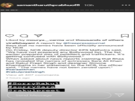 However, recently NCB’s director KPS Malhotra has dismissed the reports stating that they have made no such list of Bollywood celebs. Now, numerous celebs and other conscious individuals have reacted to the same. Among them is Samantha Akkineni who has now shared a few posts on her Instagram handle while expressing her opinion on the same. She also writes #SorryRakul and #SorrySara along with the same as a note of apology to both the actresses who were subjected to backlash because of the fake reports.