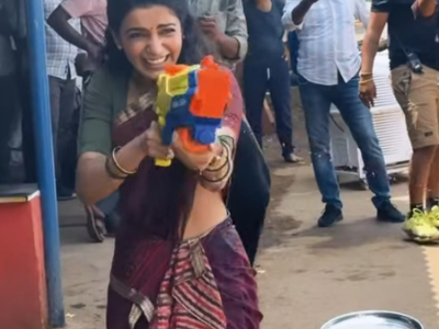 Wishing everyone on the color of festivals, she captioned the post, "Dishkiyaoon...Happy Holi Bangaaralu...From the sets of #MaaIntiBangaaram #MiBonMay15th (sic)"
