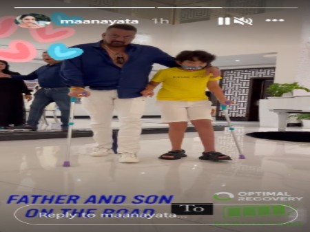 Sanjay Dutt and Manyata are one of B-town's most adorable couples the duo have gone through a lot of ups and downs in the marital life. Maanayata Dutt took to her Instagram stories to post a video of Sanjay Dutt and their son. In the video, we can see both Sanjay and his son holding a stick and limping while they walk towards the camera. Maanayata wrote, “Father and son on the road to optimal recovery”. Going by the pic it looks like the father son duo are recovering from a injury. Sanjay can be seen wearing white jeans and a blue shirt. His gold chain was dangling around his neck, and white sneakers adding to his look.