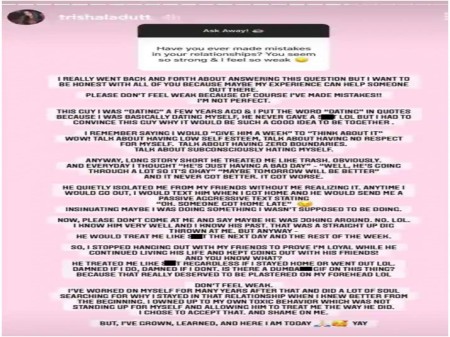 Elaborating further, Trishala wrote “he quietly isolated me from my friends without me realizing it. Anytime I would go out, I would text him when I got home and he would send me a passive-aggressive text stating ‘oh, someone got home late’ (wink emoji) insinuating maybe I was doing something I wasn't supposed to be doing. Now, please don't come at me and say maybe he was joking around. No. Lol. I know him very well and I know his past. That was a straight up dig thrown at me,” she wrote. Trishala said that her boyfriend would ‘treat me like sh*t. “So, I stopped hanging out with my friends to prove I'm loyal while he continued living his life and kept going out with his friends! And you know what? He treated me like sh*t regardless if I stayed home or went out lol. Damned if I do, damned if I don't. Is there a dumba** gif on this thing? Because that really deserved to be plastered on my forehead lol,” she further explained. She also urged her fans not to feel weak, saying, “I’ve worked on myself for many years after that and did a lot of soul searching for why I stayed in that relationship when | knew better from the beginning. I owned up to my own toxic behavior which was not standing up for myself and allowing him to treat me the way he did. I chose to accept that. And shame on me. But, I've grown, learned, and here I am today. Yay.” Trishala was raised by her maternal grandparents in USA, where she currently stays. Her father Sanjay Dutt is now married to Maanyata and the couple are parents to twins Shahraan and Iqra. Trishala Dutt lost her mother Richa Sharma to brain tumor at a very early age.