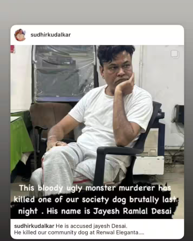 "He is accused jayesh Desai. He killed our community dog at Renwal Eleganta. FIR REGISTERED at police stn but now he is on bail bcos our animal laws are very week and it's bailable offence. Value of our community dogs is only Rs 50???? Shame on this person who killed helpless and innocent dog named as JAY....," read the post caption.