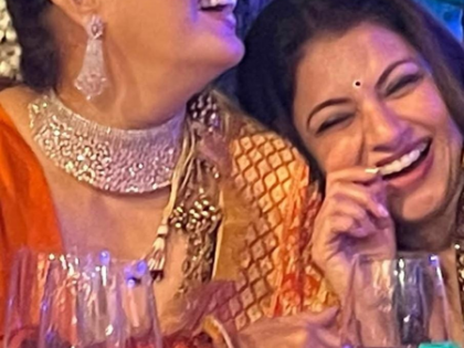 Another picture captures Sheeba and Bhagyashree enjoying a carefree moment in a swimming pool. A third picture features them dressed in elegant traditional attire, sharing a candid laugh at what looks like a celebration party.