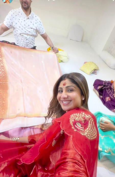 In a video shared by Shilpa, the actress is seen sitting gracefully in a stunning red salwar kameez as a salesman displays a variety of elegant sarees in front of her.
