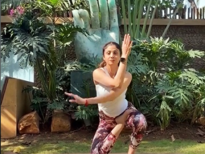 In the video clip, Shilpa was seen balancing perfectly on a yoga mat placed on a lawn, and demonstrated strength, flexibility and body control while performing Vatayansana