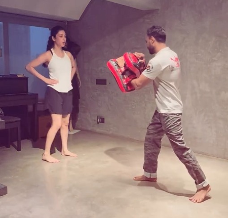 Taking to her Insta Stories, she posted a video of herself working on her arm strength using resistance bands hanging from the roof. In the next clip, she was seen practicing her impressive kickboxing moves with her trainer.