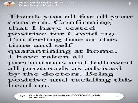 Siddhant Chaturvedi has tested positive for Covid-19. The actor took to his Instagram story to confirm the same. "I ...