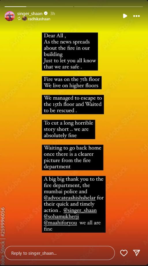 Taking to his Instagram Story, Shaan, whose real name is Shantanu Mukherjee, shared how he and his family escaped the dangerous situation and wrote, "Dear All, as the news spreads about the fire in our building, just to let you all know that we are safe. The fire was on the 7th floor; we live on higher floors. We managed to escape to the 15th floor and waited to be rescued. To cut a long horrible story short, we are absolutely fine, waiting to go back home once there is a clearer picture from the fire department."
