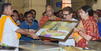 Smriti Irani was seen dressed in a traditional Indian red saree as she visited the temple.