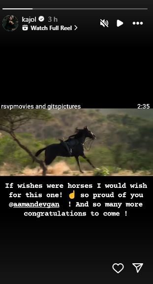 Kajol shared a link of the trailer on her Instagram Story and wrote, "If wishes were horses, I would wish for this one! So proud of you @aamandevgan! And so many more congratulations to come!"