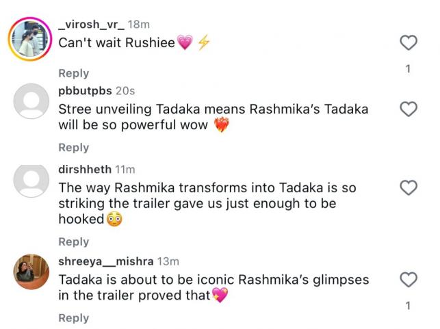 A netizen’s comment read, “Rushieeee🩷 the trailer was amazing can't wait to see you on theatres”Stree unveiling Tadaka means Rashmika's Tadaka will be so powerful wow” read a person’s comment.