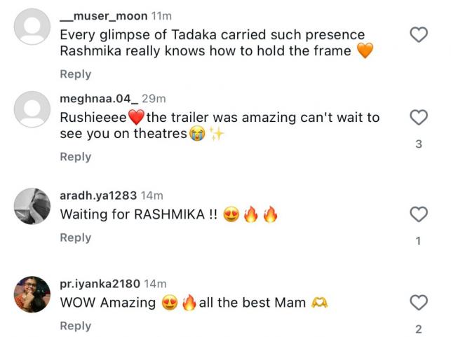 A netizen praised Rashmika’s Tadaka, writing, “Tadaka is about to be iconic Rashmika's glimpses in the trailer proved that” A comment read, “Waiting for RASHMIKA!”
