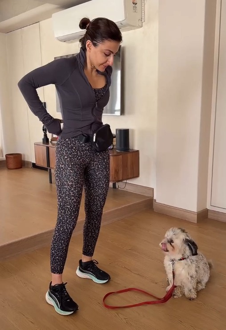 Sharing the everlasting dilemma of a pet parent, Soha uploaded a video on social media where she was seen being chased by her fur baby, both while getting ready for the gym and also during her workout session.