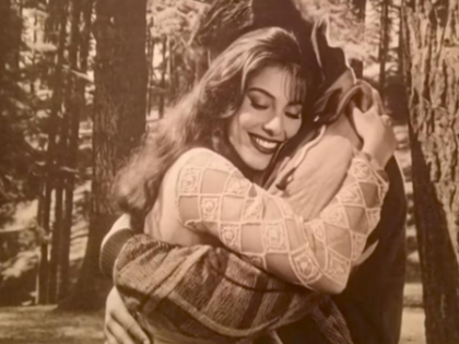 The monochrome AI video shows Somy Ali embracing Mithun Chakraborty in a scenic outdoor setting.