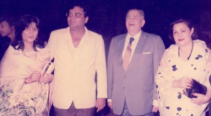 In the picture, a young Subhash Ghai is seen posing alongside Raj Kapoor and Kapoor's wife Krishna Raj Kapoor.