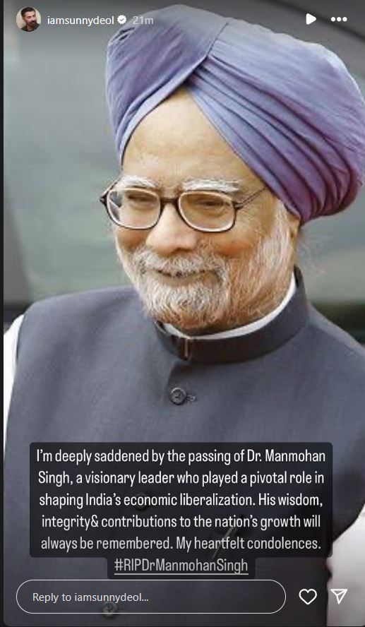 "I'm deeply saddened by the passing of Dr. Manmohan Singh, a visionary leader who played a pivotal role in shaping India's economic liberalization. His wisdom, integrity& contributions to the nation's growth will always be remembered. My heartfelt condolences. #RIPDr ManmohanSingh," Sunny wrote.