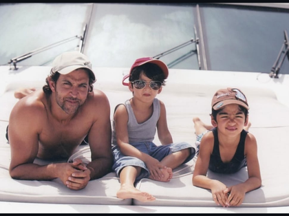 The actor is seen lying beside the boys, with the children sporting caps and sunglasses while sitting comfortably next to their father.