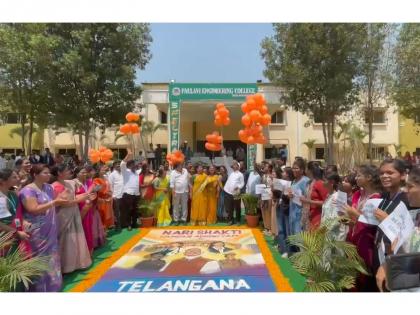 Rangareddy (Telangana) [India], April 17 : A large-scale "Nari shakti" 3D sand rangoli art event was organised by the Mahila Morcha at Pallavi Engineering College in Hayatnagar, where students and BJP leaders gathered to express gratitude to Prime Minister Narendra Modi amid ongoing parliamentary discussions on the women's reservation bill.