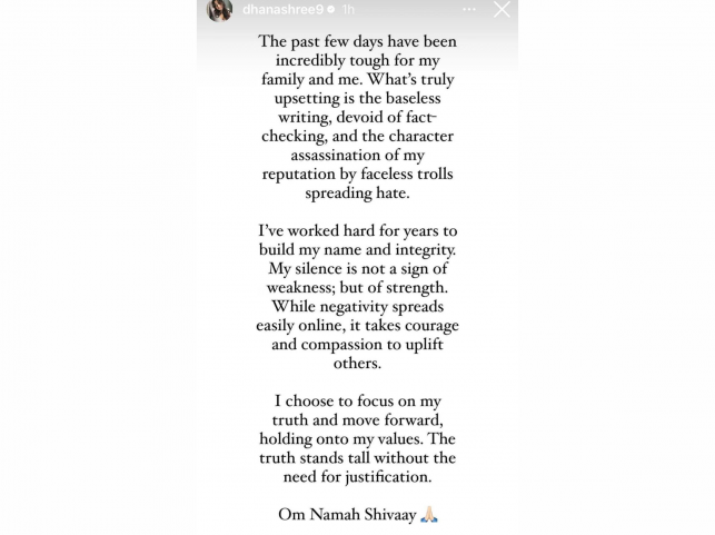 Dhanashree Verma, choreographer and wife of Indian cricketer Yuzvendra Chahal, has addressed the ongoing divorce rumours surrounding her marriage. Taking to Instagram, Verma dismissed the speculations as baseless and an attack on her character.