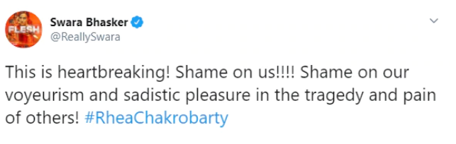 Rhea Chakraborty's father Indrajith Chakraborty released a statement on Saturday, after the court sent his son on NCB custody till 9th September in an investigation into drug abuse allegations following the death of Sushant Singh Rajput.In light of the events, Indrajit Chakraborty, retired army surgeon had released a statement which read, "Congrats India ,you have arrested my son, I am sure next in line is my daughter. .You have effectively demolished a middle class family. But of course for sake of justice everything is justified. Jai Hind!" Soon after the message went viral, Swara Bhasker came out in defence of the family. Taking to her Twitter Swara wrote, This is heartbreaking! Shame on us!!!! Shame on our voyeurism and sadistic pleasure in the tragedy and pain of others! #RheaChakrobarty," tweeted Swara.