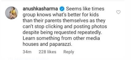 Actor Anushka Sharma has lashed out at a publication posting a picture of her and Virat Kohli’s daughter Vamika on their social media platform. Taking to their Instagram account, the publication shared Vamika's photo after she returned with mother Anushka and father Virat Kohli from their recent Maldives vacation.After the publication shared the now-deleted post on Tuesday, Anushka commented, "Seems like times group knows what's better for kids than their parents themselves as they can't stop clicking and posting photos despite being requested repeatedly. Learn something from other media houses and paparazzi." The post had also tagged Vamika along with Anushka and Virat and included hashtags of their names as well.