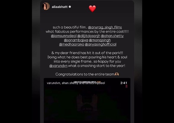 Alia Bhatt highlighted that Varun has made a smashing start to the year with Border 2, and honestly, we agree! “Such a beautiful film...@anurag_singh_films! What fabulous performances by the entire cast!!! @iamsunnydeol @diljitdosanjh @ahan.shetty @sonambajwa @monajsingh @medhaarana @anyasinghofficial & my dear friend has hit it out of the park!! Doing what he does best pouring his heart & soul into every single frame..so happy for you @varundvn what a smashing start to the year! Congratulations to the entire team,” she wrote.