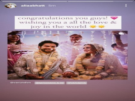 Several celebs have penned sweet notes for Varun and Natasha as they congratulated them for the beginning of a new phase in their respective lives. Now, joining the squad is Varun’s first co-star Alia Bhatt who has wished the couple love and happiness in their married life. For the uninitiated, Varun and Alia had made their Bollywood debut together with 2012 release Student of The Year. The Raazi star took to her Instagram story to send love to the newlyweds and shared Varun and Natasha’s wedding pic. In the caption, Alia wrote, “Congratulations you guys! Wishing you all the love & joy in the world.” On the work front, Dhawan will be seen in “Jug Jug Jeeyo”, alongside Anil Kapoor, Neetu Kapoor and Kiara Advani.